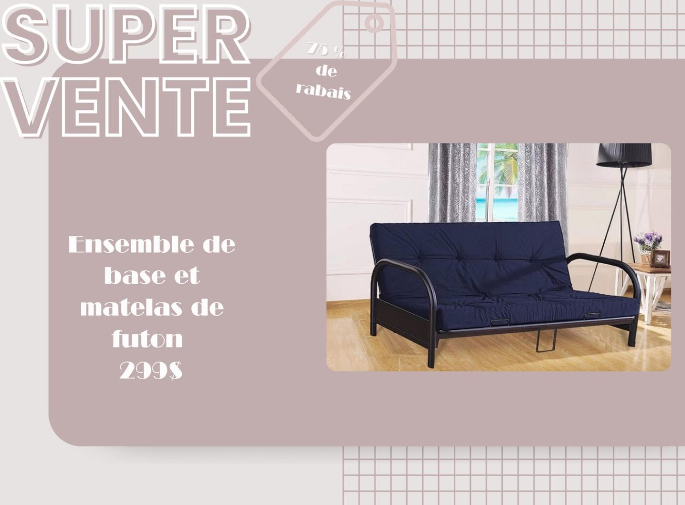 Ensemble de futon incluant la base en métal noir et le matelas.